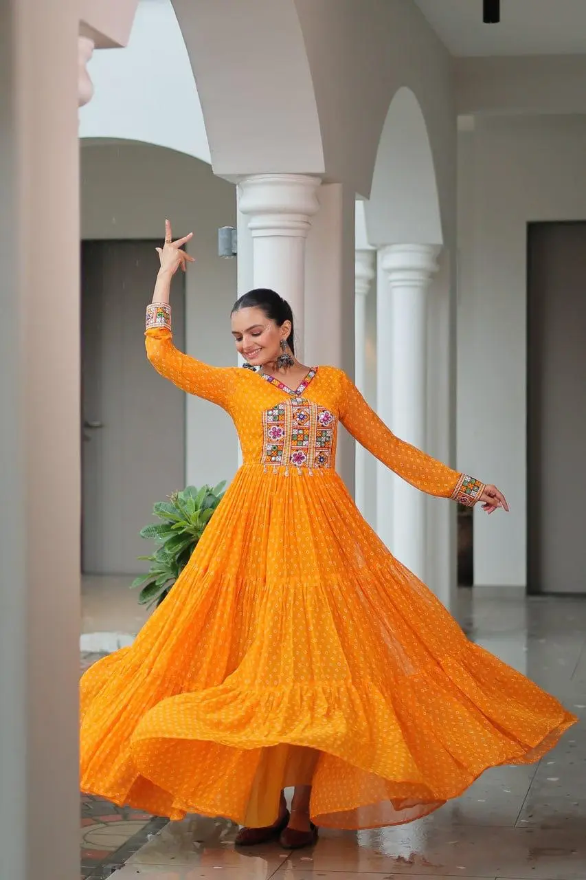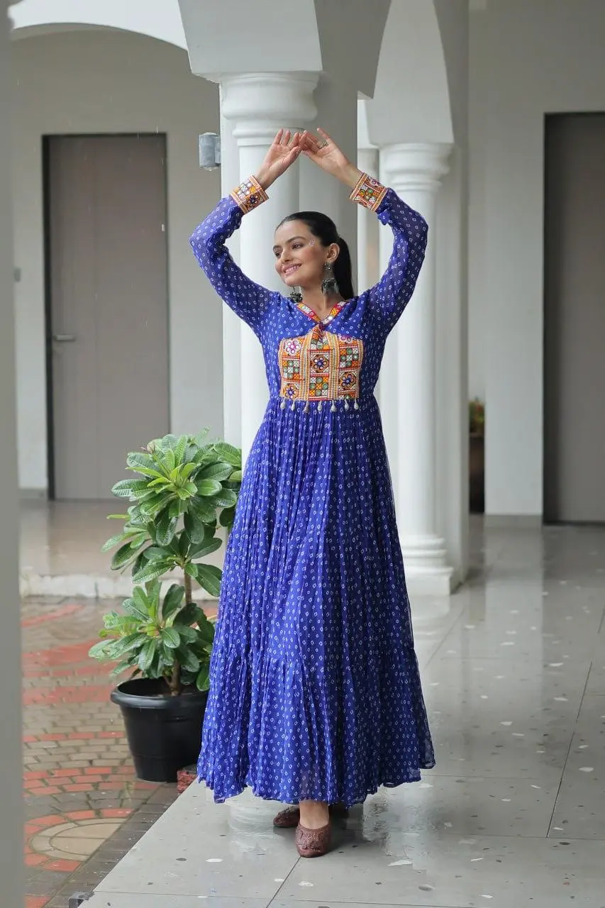 Gown:- πŸ‘‡πŸ» πŸ‘‰πŸ» Fabrics & Work :- Bandhani Print work with kutchi patchework in Faux Georgette. πŸ‘‰πŸ» Sleeves :- Full Sleeves πŸ‘‰πŸ» Length :- 56 Inch πŸ‘‰πŸ» Flair :- 12 Meter πŸ‘‰πŸ» Lining(Inner) :- Cotton (full upto bottom) πŸ‘‰πŸ» Colour :- 3(Yellow, Blue, Pink) πŸ‘‰πŸ» Package Contains :- Gown, DM to order +16892678636 whatsapp/call/message 🌿🌿🌿🌿